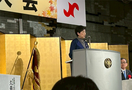 大会は秋川雅史氏の国家独唱から始まり、「商工会議所女性会の歌」斉唱、「商工会議所女性会活動指針」唱和に続き、主催者挨拶として全国商工会議所女性会連合会 久保田光恵副会長・会長職務執行者、日本商工会議所 小林健会頭よりご挨拶がありました。その後、来賓挨拶として竹内真二経済産業大臣政務官、小池百合子東京都知事よりご祝辞を頂きました。