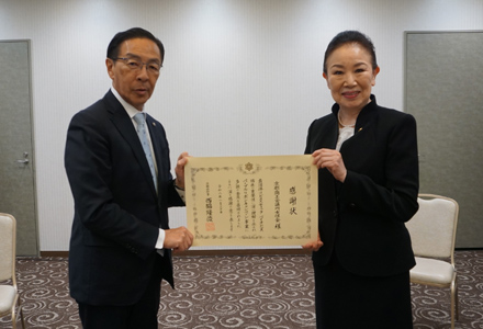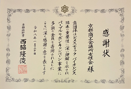 京都府によるパープルリボンキャンペーンへの支援として、10万円を寄附したことに対し、感謝状の贈呈を受けました。